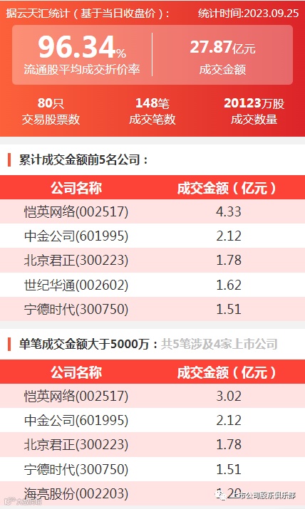 2023年9月25日,大宗交易成交金额27.87亿元,交易股票数80只,成交笔数148笔,流通股平均成交折价率96.34%,成交数量20123万股。