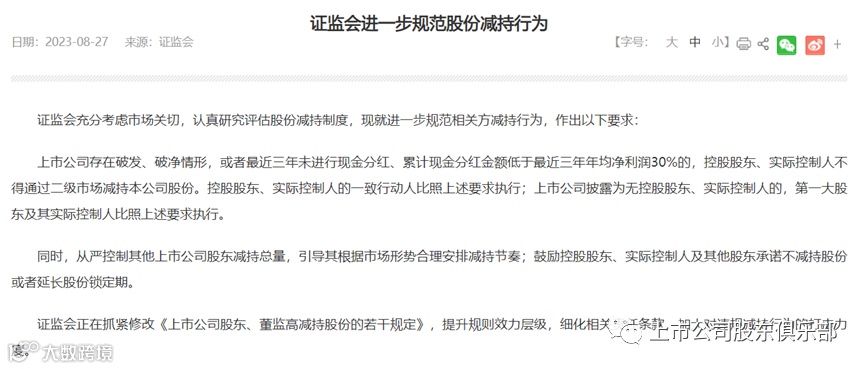 2023年8月27日证监会发布《证监会进一步规范股份减持行为》的通知。