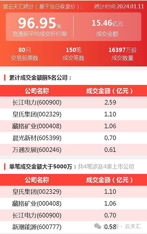 2024年1月11日,大宗交易成交金额15.46亿元,交易股票数80只,成交笔数150笔,流通股平均成交折价率96.95%,成交数量16397万股。
