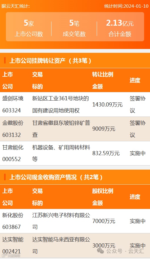 2024年1月10日,资产交易成交金额2.13亿元,上市公司5家,成交5笔,上市公司挂牌转让资产3笔,现金收购资产2笔。
