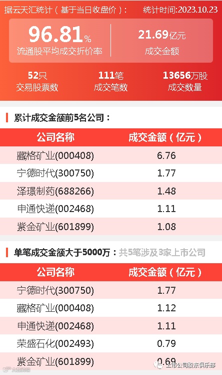 2023年10月23日,大宗交易成交金额21.69亿元,交易股票数52只,成交笔数111笔,流通股平均成交折价率96.81%,成交数量13656万股。