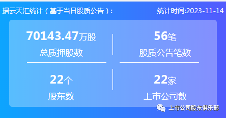 2023年11月14日,股票质押总质押股数7.01亿股,上市公司数22家,股质公告笔数56笔,股东数22个。
