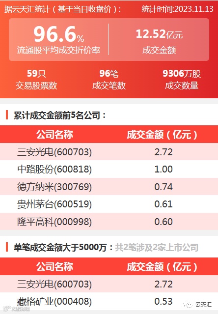 2023年11月13日,大宗交易成交金额12.52亿元,交易股票数59只,成交笔数96笔,流通股平均成交折价率96.6%,成交数量9306万股。