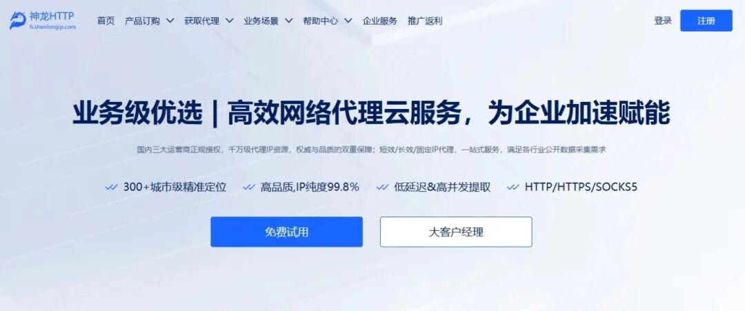 通过与各大网络运营商的深度合作,神龙代理拥有超3000万+的代理资源储备,这些资源均获得正规授权,每个IP都经过严格的筛选和验证,确保可用率高达99.9%。