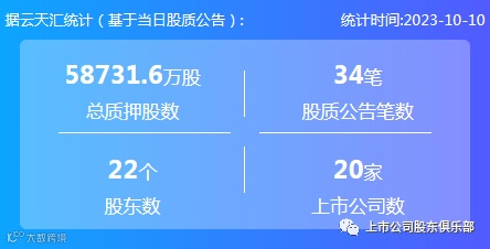 2023年10月10日,股票质押总质押股数5.87亿股,上市公司数20家,股质公告笔数34笔,股东数22个。