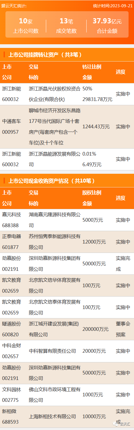 2023年9月21日,资产交易成交金额37.93亿元,上市公司10家,成交13笔,上市公司挂牌转让资产3笔,现金收购资产10笔。