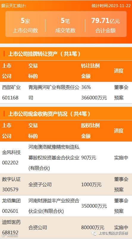 2023年11月22日,资产交易成交金额79.71亿元,上市公司5家,成交5笔,上市公司挂牌转让资产1笔,现金收购资产4笔。