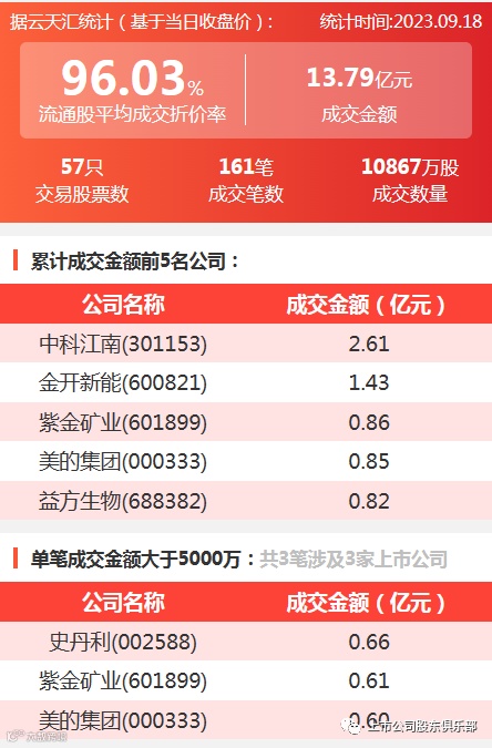 2023年9月18日,大宗交易成交金额13.79亿元,交易股票数57只,成交笔数161笔,流通股平均成交折价率96.03%,成交数量10867万股。