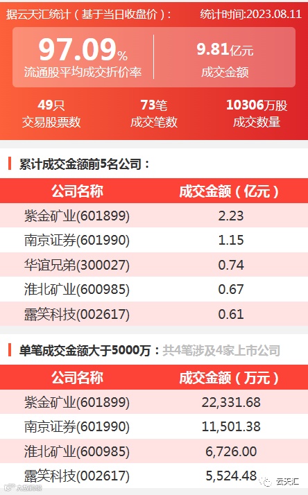 2023年8月11日,大宗交易成交金额20.51亿元,交易股票数80只,成交笔数141笔,流通股平均成交折价率96.25%,成交数量19593万股。