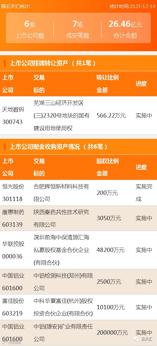 2023年12月19日,资产交易成交金额26.46亿元,上市公司6家,成交7笔,上市公司挂牌转让资产1笔,现金收购资产6笔。