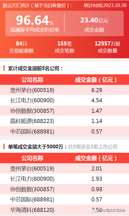 2023年10月30日,大宗交易成交金额23.40亿元,交易股票数84只,成交笔数155笔,流通股平均成交折价率96.64%,成交数量12557万股。