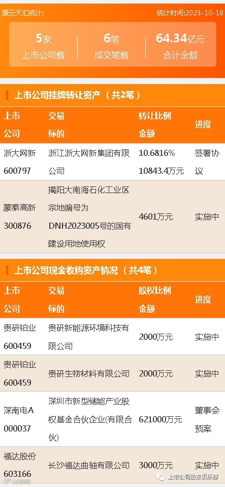 2023年10月18日,资产交易成交金额64.34亿元,上市公司5家,成交6笔,上市公司挂牌转让资产2笔,现金收购资产4笔。