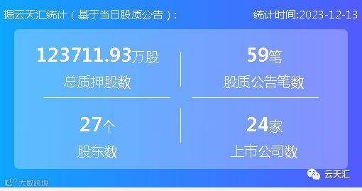 2023年12月13日,股票质押总质押股数12.37亿股,上市公司数24家,股质公告笔数59笔,股东数27个。