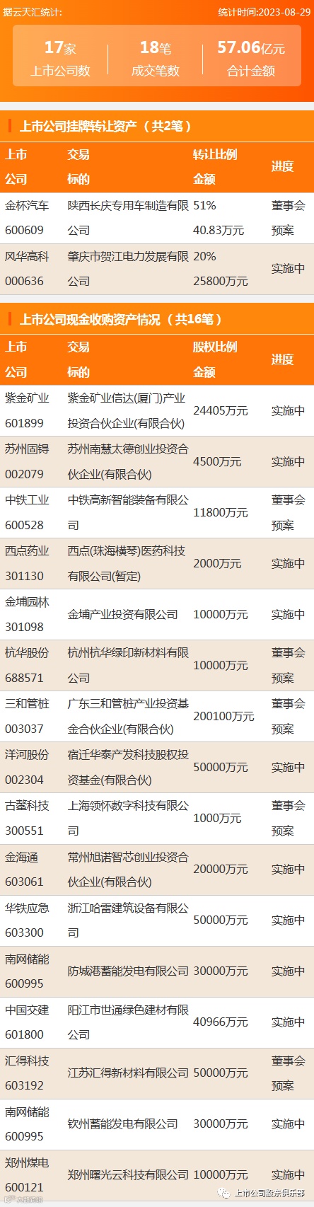 2023年8月29日,资产交易成交金额57.06亿元,上市公司17家,成交18笔,上市公司挂牌转让资产2笔,现金收购资产16笔。