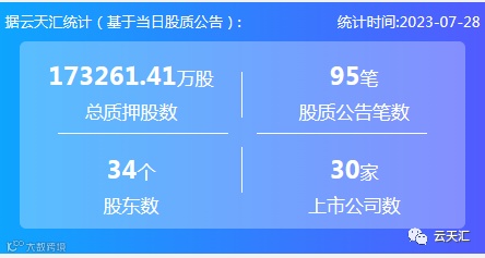 2023年7月28日,股票质押总质押股数17.32亿股,上市公司数30家,股质公告笔数95笔,股东数34个。