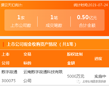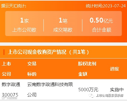 2023年7月24日,资产交易成交金额0.5亿元,上市公司1家,成交1笔,上市公司现金收购资产1笔。
