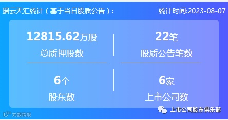 2023年8月7日,股票质押总质押股数1.28亿股,上市公司数6家,股质公告笔数22笔,股东数6个。