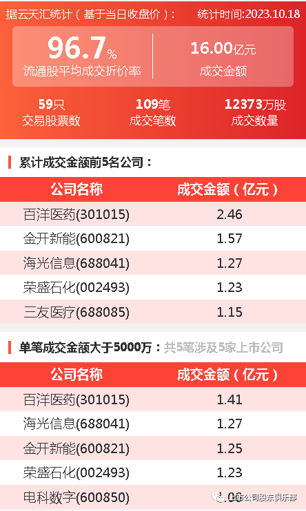 2023年10月18日,大宗交易成交金额16亿元,交易股票数59只,成交笔数109笔,流通股平均成交折价率96.7%,成交数量12373万股。