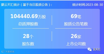 2023年8月30日,股票质押总质押股数10.44亿股,上市公司数26家,股质公告笔数69笔,股东数28个。