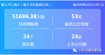 2023年9月13日,股票质押总质押股数5.17亿股,上市公司数24家,股质公告笔数53笔,股东数24个。