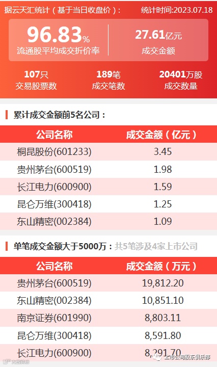 2023年7月18日,大宗交易成交金额27.61亿元,交易股票数107只,成交笔数189笔,流通股平均成交折价率96.83%,成交数量20401万股。