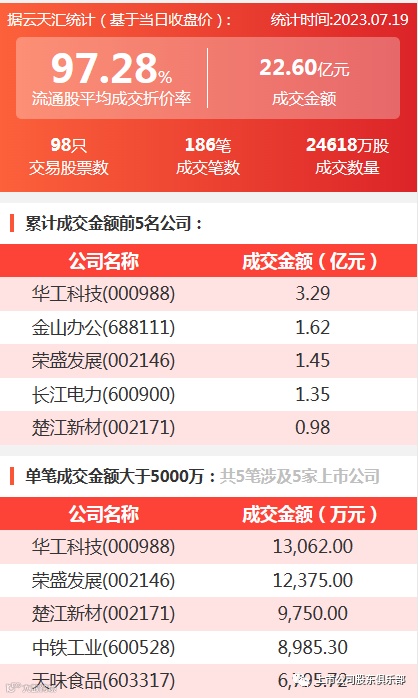 2023年7月19日,大宗交易成交金额22.60亿元,交易股票数98只,成交笔数186笔,流通股平均成交折价率97.28%,成交数量24618万股。