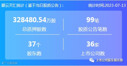 2023年7月13日,股票质押总质押股数328480.54万股,上市公司数36家,股质公告笔数99笔,股东数37个。