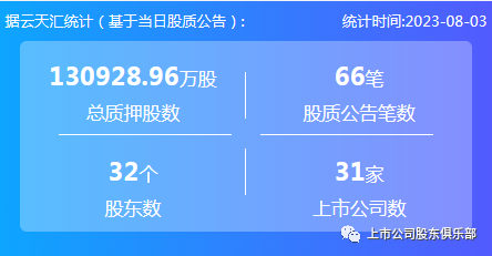 2023年8月3日,股票质押总质押股数13.09亿股,上市公司数31家,股质公告笔数66笔,股东数32个。