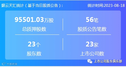 2023年8月18日,股票质押总质押股数9.55亿股,上市公司数23家,股质公告笔数56笔,股东数23个。