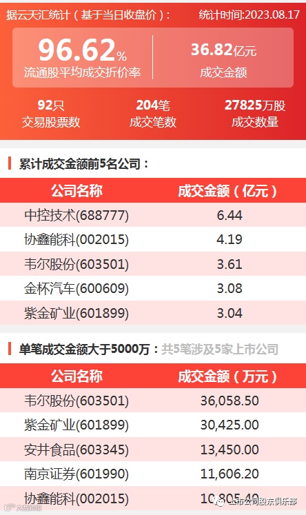 2023年8月17日,大宗交易成交金额36.82亿元,交易股票数92只,成交笔数204笔,流通股平均成交折价率96.62%,成交数量27825万股。