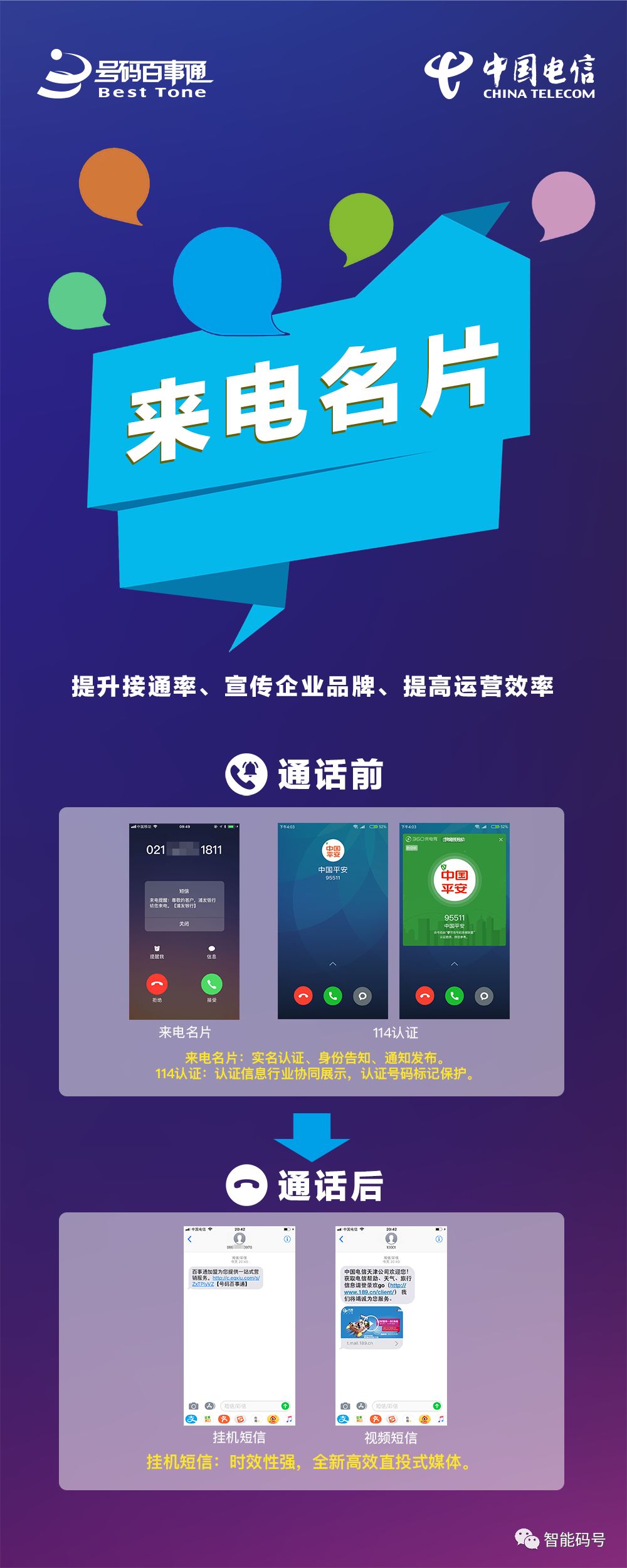依托中国电信基础网络能力,智能码号产品保障用户安全的通话环境。实现了“个人与企业、通讯与互联网”的智能连接,打造中国电信“可信号码、可靠服务”!