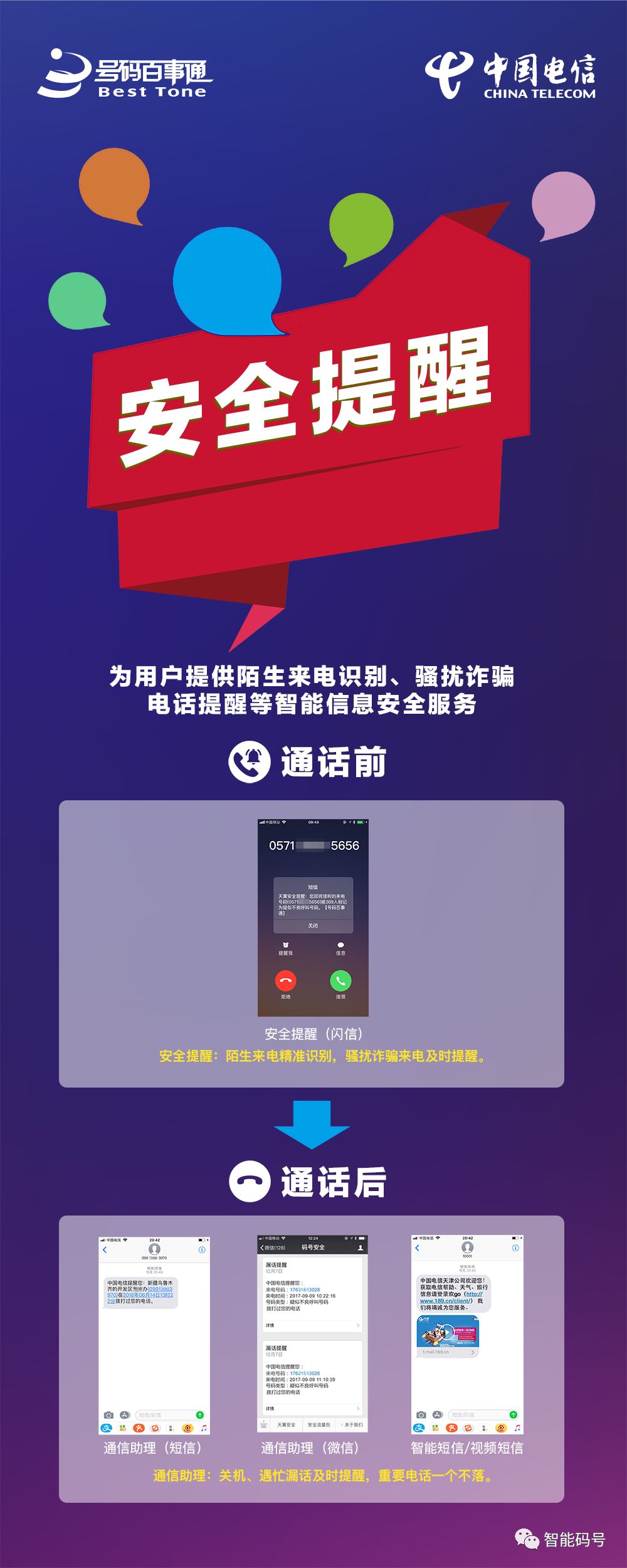 基于庞大的、可信的黑白灰数据库,智能码号产品为个人用户提供安全提醒——“陌生来电精准识别,骚扰、诈骗电话提前知晓”;为政企客户提供来电名片——“为政企电话主动亮明身份,保护消费者远离骚扰诈骗”。目前已有2.6亿中国电信用户开通了安全提醒,200多万政企用户开通了来电名片。
