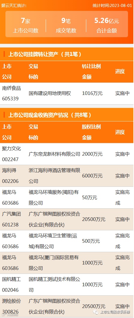 2023年8月1日,资产交易成交金额5.26亿元,上市公司7家,成交9笔,上市公司挂牌转让资产1笔,现金收购资产8笔。