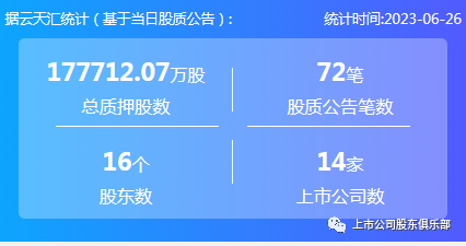 2023年6月26日,股票质押总质押股数177712.07万股,上市公司数14家,股质公告笔数72笔,股东数16个。