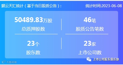 2023年6月8日,股票质押总质押股数50489.83万股,上市公司数23家,股质公告笔数46笔,股东数23个。