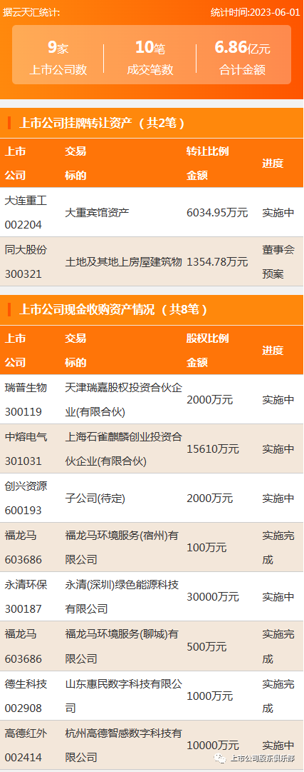 2023年6月1日,资产交易成交金额6.86亿元,上市公司9家,成交10笔,上市公司挂牌转让资产2笔,现金收购资产8笔。