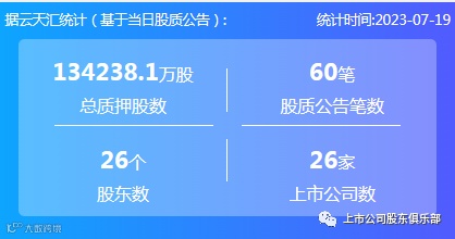 2023年7月19日,股票质押总质押股数134238.1万股,上市公司数26家,股质公告笔数60笔,股东数26个。
