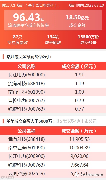 2023年7月10日,大宗交易成交金额18.5亿元,交易股票数87只,成交笔数134笔,流通股平均成交折价率96.43%,成交数量15560万股。