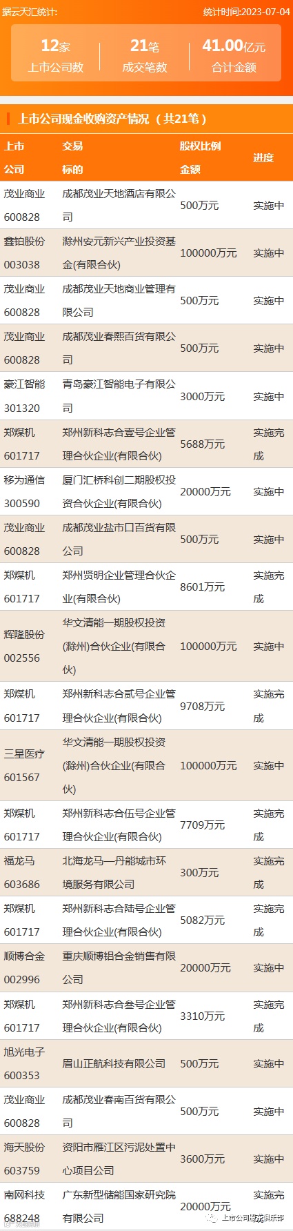 2023年7月4日,资产交易成交金额41.00亿元,上市公司12家,成交21笔,上市公司现金收购资产21笔。