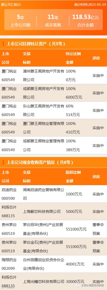 2023年5月19日,资产交易成交金额118.53亿元,上市公司5家,成交11笔,上市公司挂牌转让资产5笔,现金收购资产6笔。