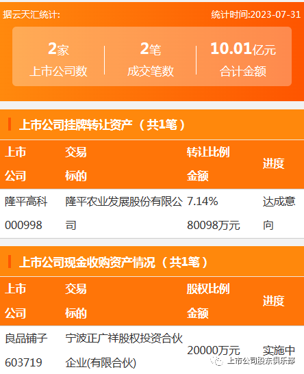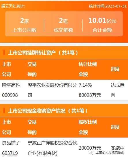 2023年7月31日,资产交易成交金额10.1亿元,上市公司2家,成交2笔,上市公司挂牌转让资产1笔,现金收购资产1笔。