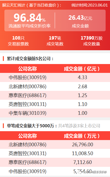 2023年6月1日,大宗交易成交金额26.43亿元,交易股票数108只,成交笔数197笔,流通股平均成交折价率96.84%,成交数量17390万股。