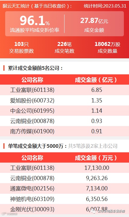 2023年5月31日,大宗交易成交金额27.87亿元,交易股票数103只,成交笔数226笔,流通股平均成交折价率96.1%,成交数量18062万股。