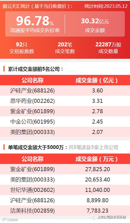 2023年5月12日,大宗交易成交金额30.32亿元,交易股票数92只,成交笔数202笔,流通股平均成交折价率96.78%,成交数量22287万股。