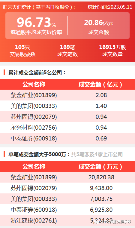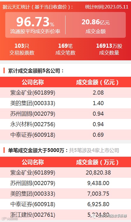 2023年5月11日,大宗交易成交金额20.86亿元,交易股票数103只,成交笔数169笔,流通股平均成交折价率96.73%,成交数量16913万股。