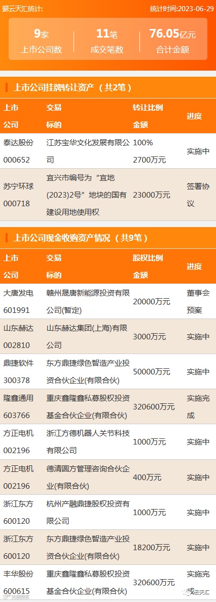 2023年6月29日,资产交易成交金额76.05亿元,上市公司9家,成交11笔,上市公司挂牌转让资产2笔,现金收购资产9笔。