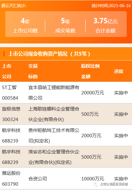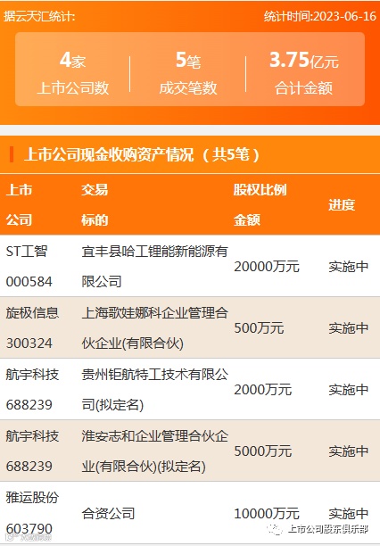 2023年6月16日,资产交易成交金额3.75亿元,上市公司4家,成交5笔,上市公司现金收购资产5笔。