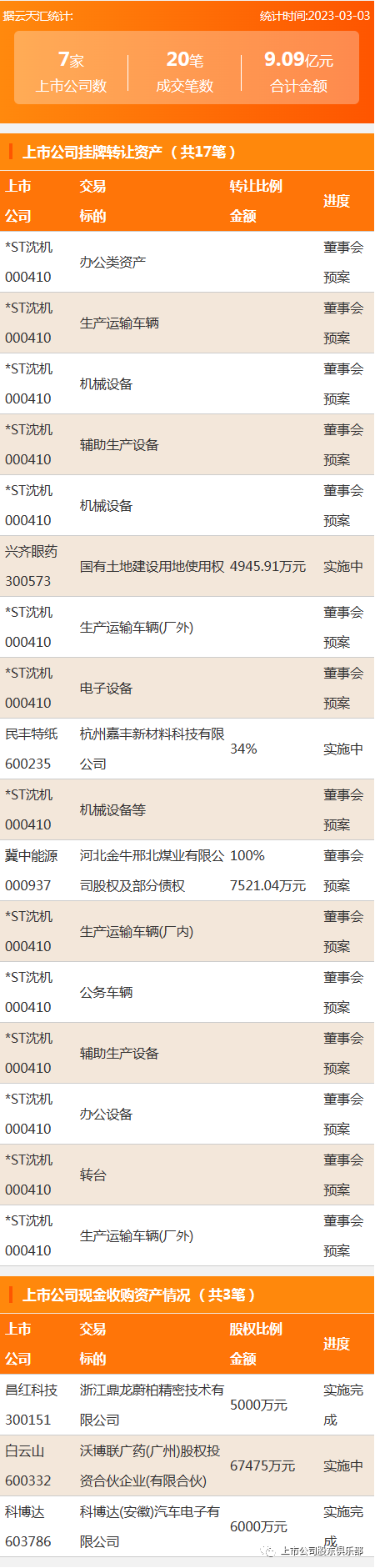 2023年3月3日,资产交易成交金额9.09亿元,上市公司7家,成交20笔,上市公司挂牌转让资产17笔,现金收购资产3笔。