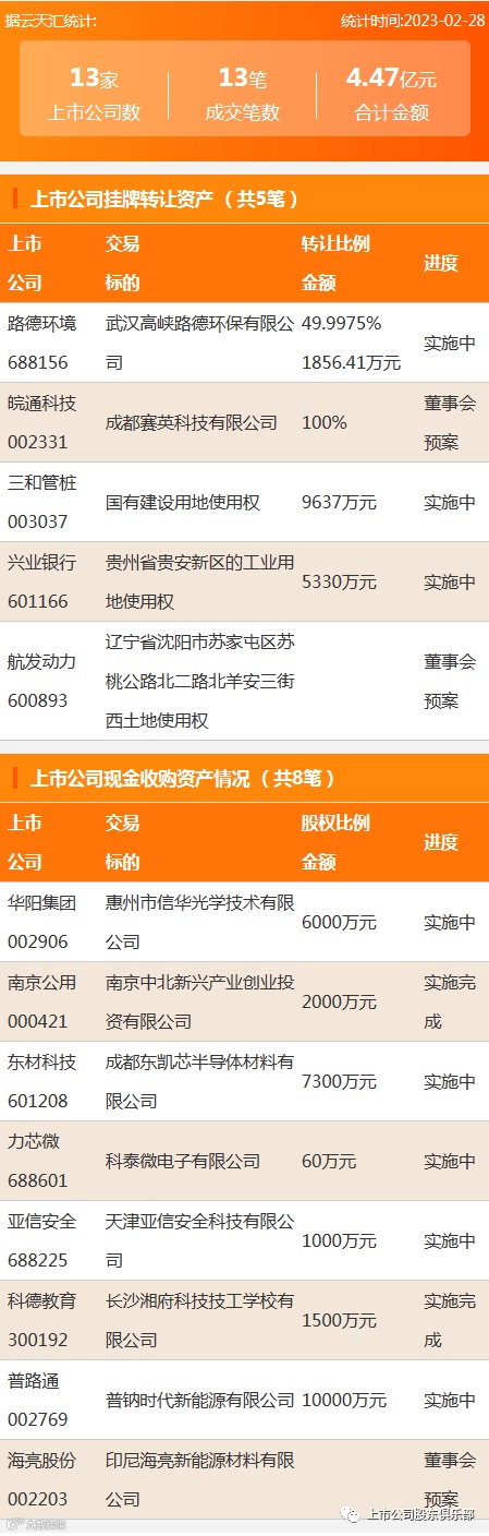 2023年2月28日,资产交易成交金额4.47亿元,上市公司13家,成交13笔,上市公司挂牌转让资产5笔,现金收购资产8笔。