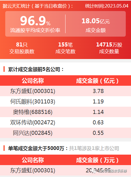 2023年5月4日,大宗交易成交金额18.05亿元,交易股票数81只,成交笔数155笔,流通股平均成交折价率96.9%,成交数量14715万股。